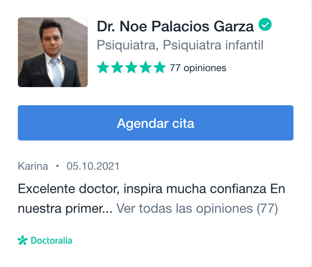«Excelente psiquiatra, muy profesional, muy sencillo y agradable en su trato con el paciente; resuelve dudas y está muy al pendiente de sus pacientes…. Gracias por todo Dr Noe Dios le bendiga siempre, un placer haber coincidido con usted y le agradecemos mucho todo lo que hizo por nuestro hijo.»